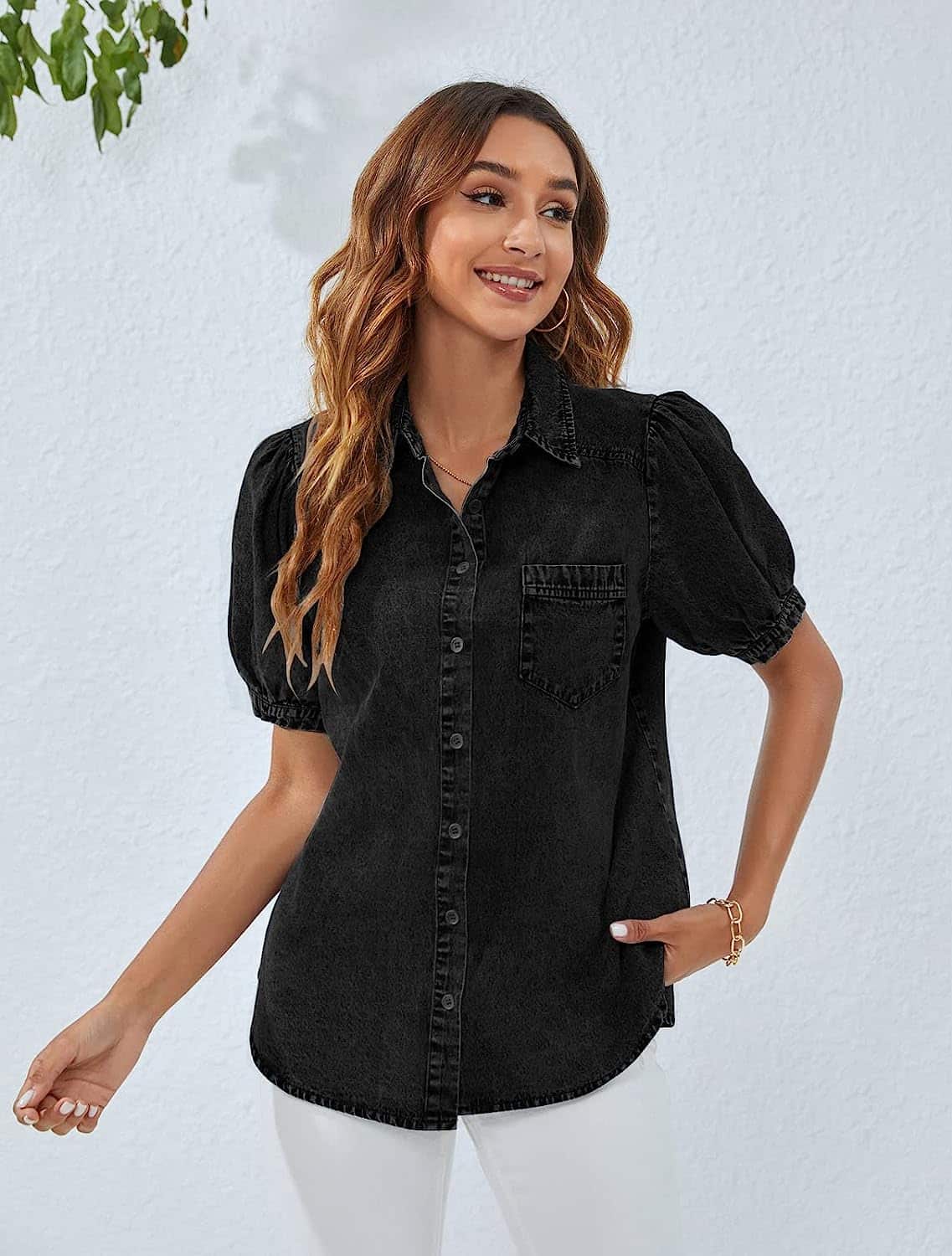 This classic shirt effortlessly elevates your office attire with its denim cloth, allowing you to maintain a business casual fashion without violating any dress codes. The charming puffy sleeves introduce a delightful contrast to the formality of the button-down closure and convertible collar, infusing a trendy and casual vibe into your daily work wardrobe. Additionally, a chest pocket serves as a functional decoration, adding a touch of style.