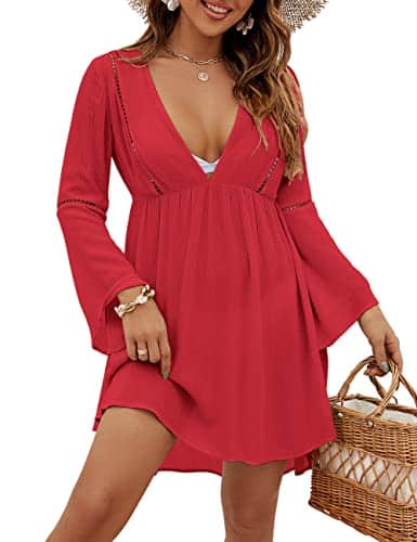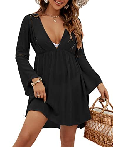 It’s the perfect time to enjoy the beach, and this dress is a must-have with its loose bell sleeves and high-low irregular hemline, providing a flowing and cooling effect on the hottest days. The patchwork waist adds a flattering touch to your figure, while the deep V-neckline allows you to showcase your favorite swimsuit. Complete your beach ensemble with sunglasses and a bag to exude femininity and elegance.